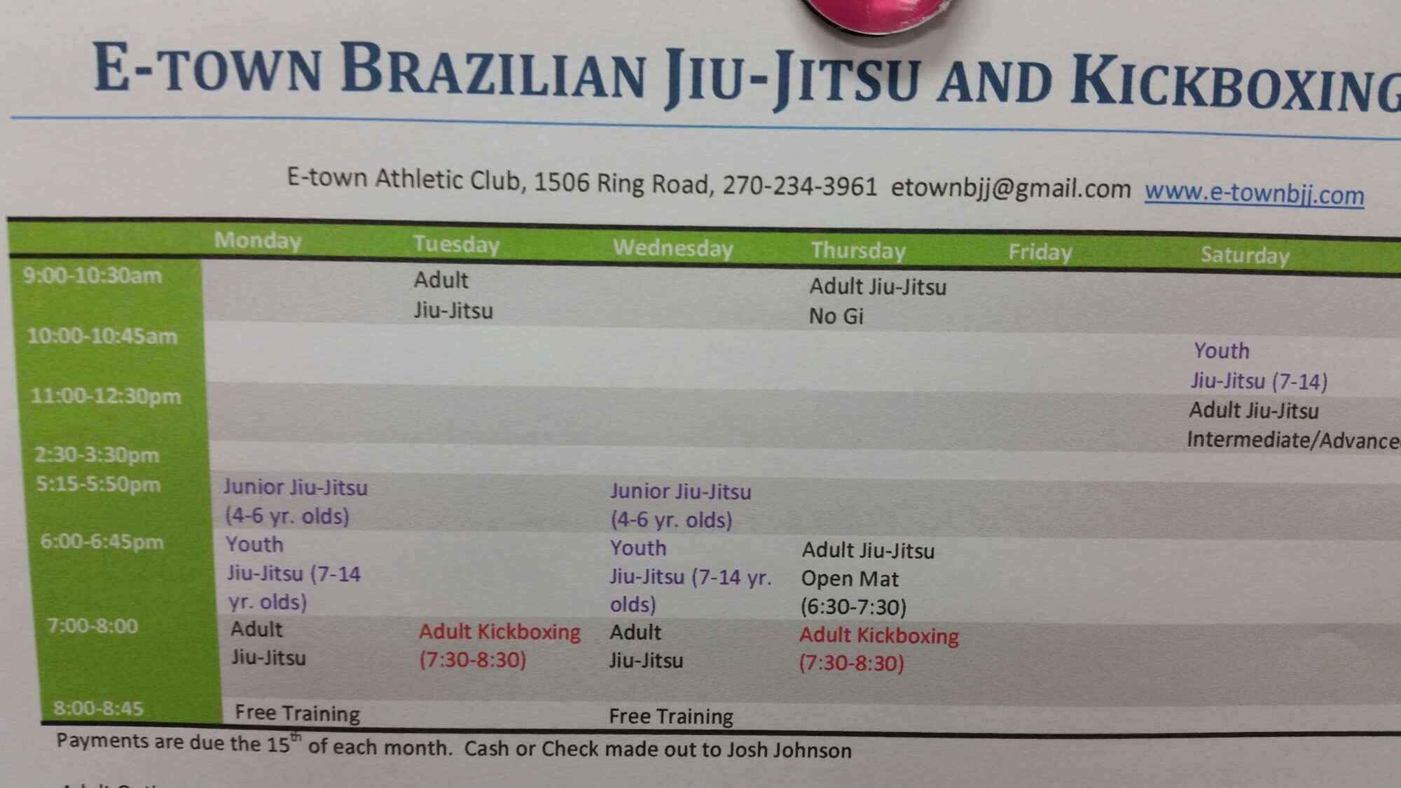 Schedule March 2016 March 15, 2016 · by Josh Class rates are monthly Adult Kickboxing and Jiu-Jitsu $75 Only Kickboxing $50 Kids classes $60 *no contracts Share this: Click to share on X (Opens in new window) X Click to share on Facebook (Opens in new window) Facebook Like Loading...